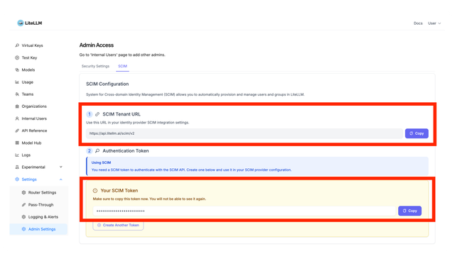 On LiteLLM, navigate to the Settings > Admin Settings > SCIM. On this page you will create a SCIM Token, this allows your IDP to authenticate to litellm /scim